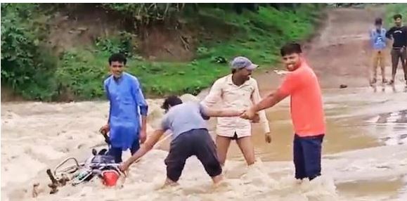 तीन फीट पानी में बह रही थी पुलिया, बाइक सहित परिवार फंसा, लोगों ने किया रेस्क्यू