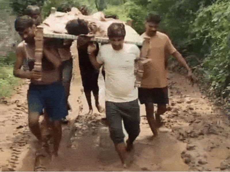बीमार को अस्पताल ले जाने के लिए सड़क नहीं मिली, इंसानियत ने रास्ता बनाया – खाट पर 2 किलोमीटर चले गांव वाले