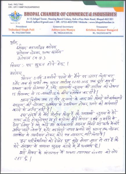 भोपाल। भोपाल चैंबर ऑफ कॉमर्स एंड इंडस्ट्रीज (BCCI) के अध्यक्ष तेजकुल पाल सिंह पाली ने शुक्रवार देर रात अपने पद से इस्तीफ़ा दे दिया। उन्होंने यह कदम आगामी चुनावों की तैयारी में कार्यकारिणी सदस्यों की अरुचि और निष्क्रियता से आहत होकर उठाया है। पाली ने अपना त्यागपत्र महासचिव आदित्य जैन ‘मान्या’ को सौंपा है, जिससे अब चैंबर के चुनाव और संचालन पर सवाल खड़े हो गए हैं।