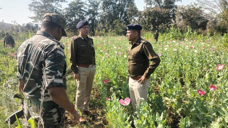 अंबिकापुर। छत्तीसगढ़ मध्य प्रदेश की सीमा में स्थित कुसमी जनपद पंचायत क्षेत्र की ग्राम पंचायत खजूरी के आश्रित गांव तुरीपानी में भी अफीम की खेती का बड़ा मामला सामने आया है. इससे 2 दिन पहले कुसमी जनपद क्षेत्र के ही त्रिपुरी गांव में भी साढ़े तीन एकड़ से अधिक क्षेत्र में अफीम की खेती का खुलासा हुआ था और प्रशासनिक टीम इसकी कार्रवाई में जुटी हुई थी. इसी बीच खजूरी पंचायत में भी अफीम की खेती का पता चला और उसके बाद देर शाम प्रशासन और पुलिस की टीम मौके पर पहुंची इसके बाद अधिकारियों ने पूरे इलाके को सील कर दिया और भारी संख्या में पुलिस बल तैनात किया गया आज इस पूरे मामले में कार्रवाई की जाएगी हालांकि अभी तक पता नहीं चल सका है कि अफीम की खेती करने वाला माफिया कौन है. खजूरी पंचायत में अफीम की खेती के मामले में पुलिस के द्वारा दो लोगों को हिरासत में लिया गया है. उनसे खेती के संबंध में पूछताछ की जा रही है, बताया जा रहा है कि दोनों व्यक्ति जमीन मालिक हैं.