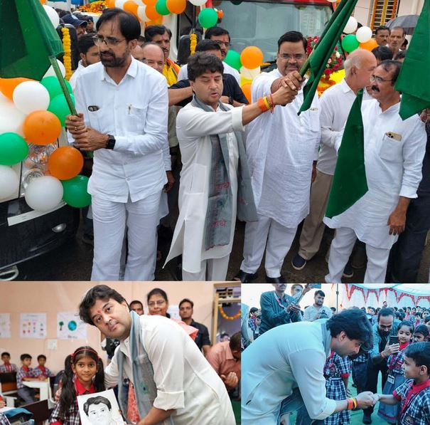 अशोकनगर। केंद्रीय मंत्री ज्योतिरादित्य सिंधिया शनिवार को ग्राम पथरिया स्थित नवीन केंद्रीय विद्यालय में आयोजित कार्यक्रम में बतौर मुख्य अतिथि पहुँचे। जहाँ उन्होंने विद्यालय को अपनी ओर से 2 आरओ वाटर प्यूरीफायर, 2 कंप्यूटर सिस्टम, संगीत यंत्र, खेल सामग्री एवं पुस्तकालय के लिए किताबें भेंट कीं। इस दौरान उन्होंने यहां अध्ययनरत बच्चों और उनके अभिभावकों से भी बातचीत की। केंद्रीय मंत्री के विद्यालय आगमन पर विद्यार्थियों ने उनका शानदार बैंड धुन गायन के साथ तिलक लगा और सरस्वती वंदना का गायन कर उत्साहपूर्वक स्वागत किया, साथ ही विद्यालय प्रशासन एवं छात्रों के अभिभावकों ने मंत्री का स्वागत करते हुए स्मृति चिह्न भेंट किया। सिंधिया ने बच्चों की कक्षाओं और एक्टिविटी रूम का भ्रमण करते हुए उनसे संवाद भी किया तथा उन्हें वाटर प्यूरीफायर, कंप्यूटर, खेल सामग्री, संगीत यंत्र और पुस्तकें भेंट कीं साथ ही उन्होंने विद्यालय के संचालन एवं शिक्षण वातावरण की सराहना करते हुए सभी को उज्ज्वल भविष्य की शुभकामनाएँ दीं।