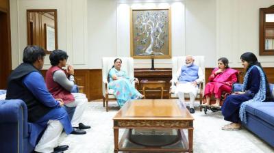वसुंधरा राजे अपने परिवार के साथ पहुंचीं प्रधानमंत्री नरेंद्र मोदी से मिलने